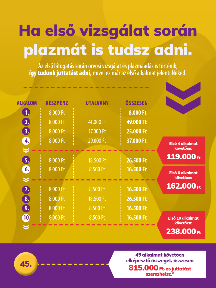 Maximum 45-ször jöhetsz el 1 évben plazmát adni. Ha mindezt összegezzük, akkor egy évben akár 815.000 Ft értékű juttatással kalkulálhatsz.