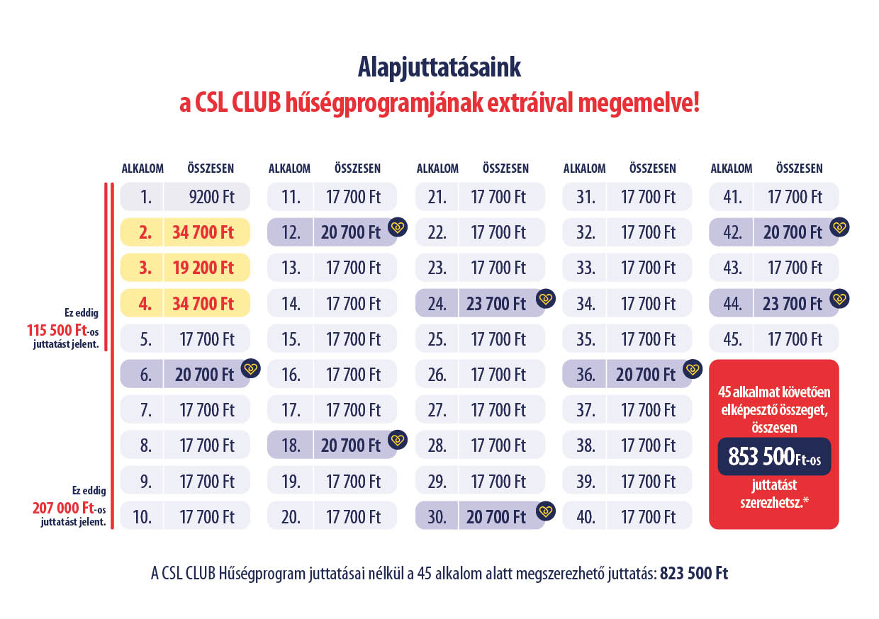 - Minden 24. és 44. alkalom után EXTRA 6 000 Ft-os juttatás jár!